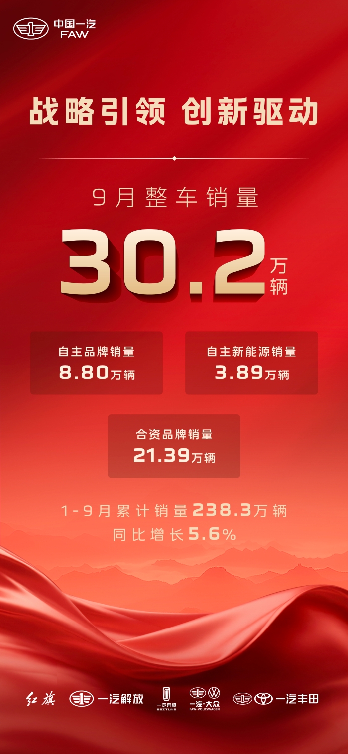 來源:創(chuàng)意傳播中心本網訊(記者 鄧涵予)2025年9月,中國一汽銷售整車30.2萬輛,同比增長6.3%。其中,自主品牌銷量8.8萬輛;自主新能源汽車銷量3.89萬輛,繼續(xù)保持高速增長態(tài)勢;合資品牌銷量21.39萬輛,持續(xù)鞏固市場領先地位。1—9月累計銷售238.3萬輛,經營質量持續(xù)提升。其中,自主品牌新能源增速顯著;節(jié)能車逆勢增長,銷量增幅明顯。數據的背后,是中國一汽踐行央企使命擔當,在自主品牌、合資品牌、海外突破、數智轉型等方面持續(xù)發(fā)力,生動詮釋勇立時代潮頭、銳意創(chuàng)新進取的奮斗之姿。