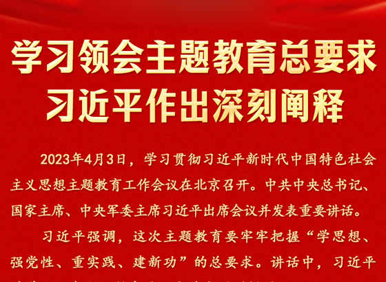 習(xí)近平指出,以縣處級以上領(lǐng)導(dǎo)干部為重點在全黨深入開展學(xué)習(xí)貫徹新時代中國特色社會主義思想主題教育,是貫徹落實黨的二十大精神的重大舉措,對于統(tǒng)一全黨思想、解決黨內(nèi)存在的突出問題、始終保持黨同人民群眾血肉聯(lián)系、推動黨和國家事業(yè)發(fā)展,具有重要意義。這次主題教育: